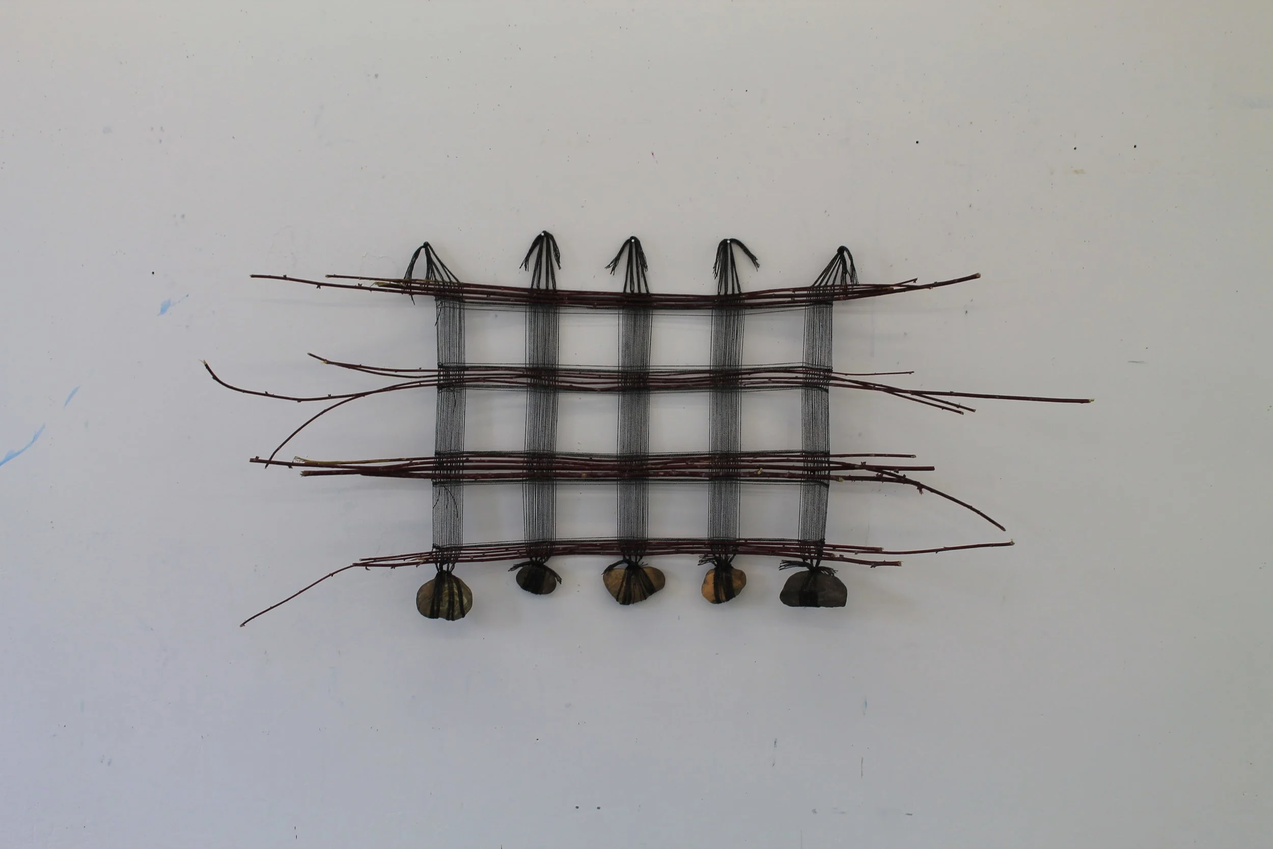 Handwoven second-hand fiiber, ethically foraged raspberry canes, Gihon river rocks, and time. 25 X 30 inches. Vermont Studio Center, 2023.