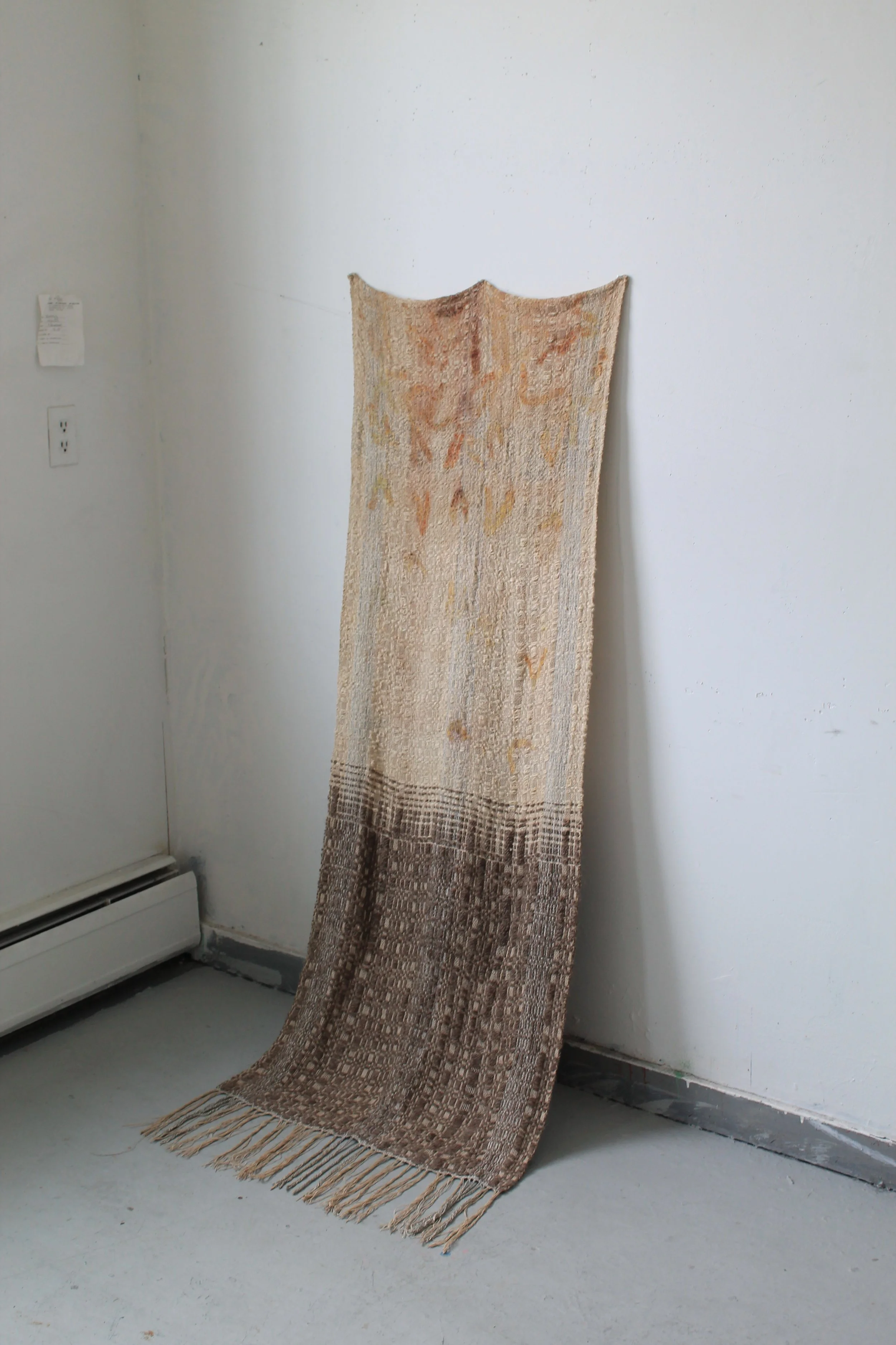 Handwoven and handspun natural wools from 1991, linen, onion food scraps, and time. Vermont Studio Center 2023.